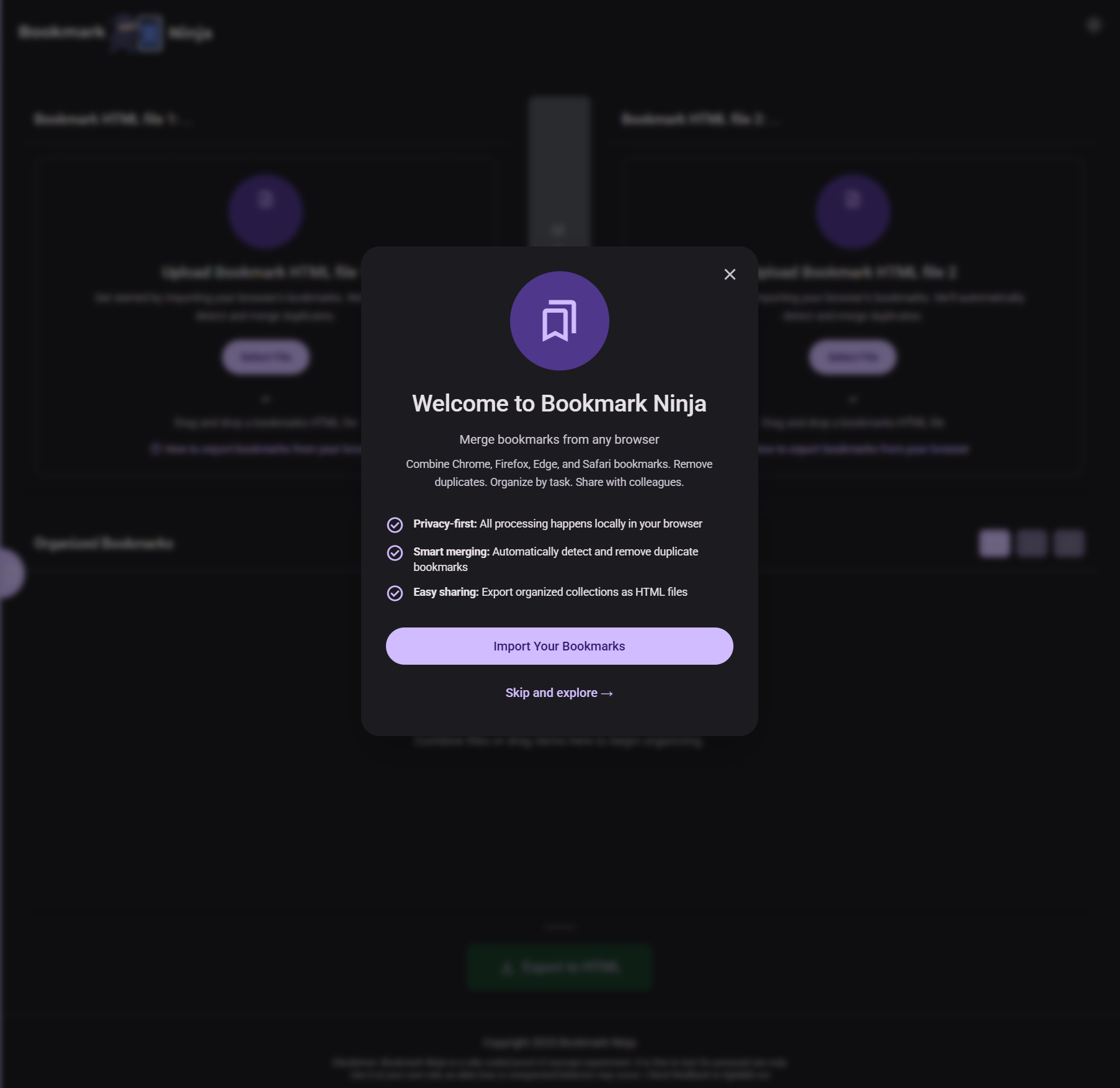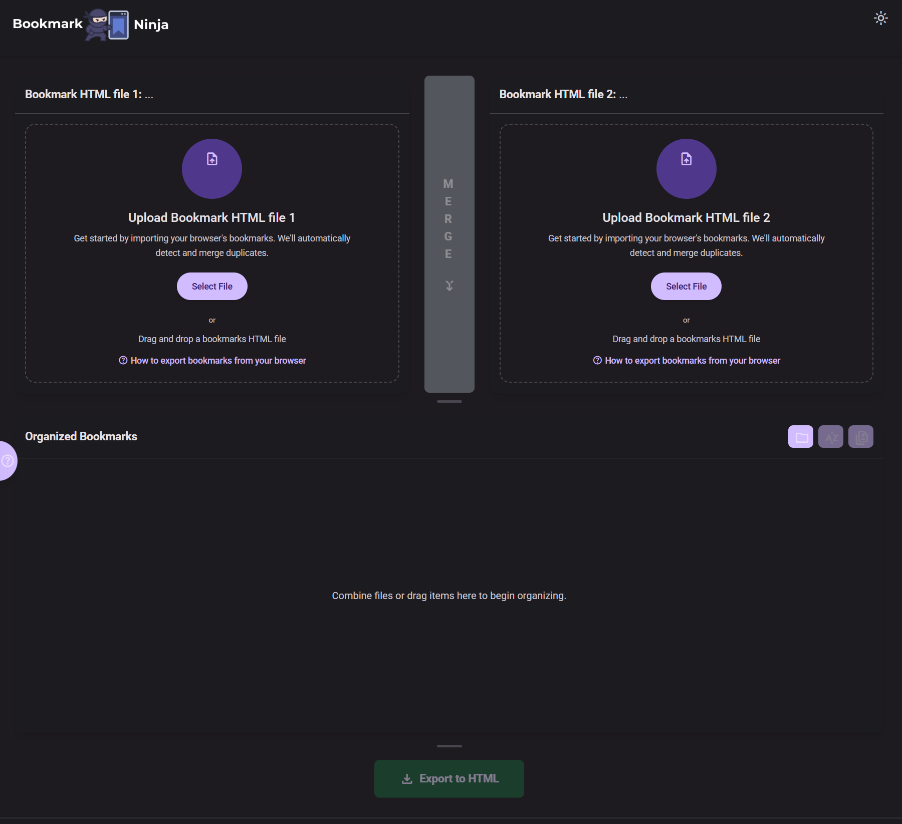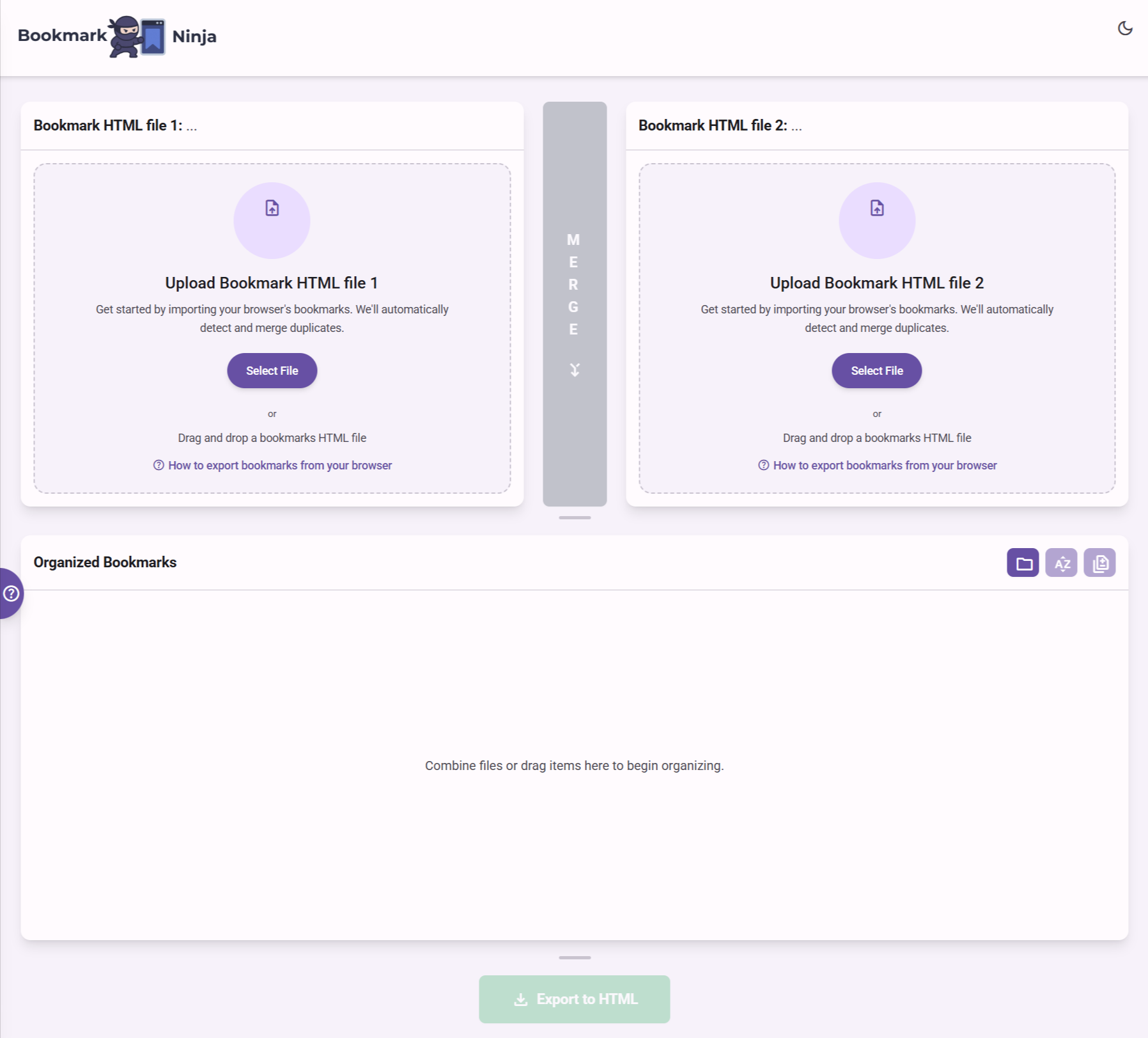 The solution: Bookmark Ninja is a vibe coded MVP that allows you merge, organize, and de-duplicate bookmarks from multiple browsers, and export a newly organized bookmarks.html file that can be uploaded to any browser.